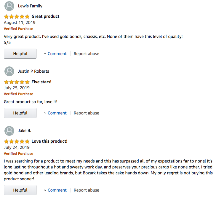 "I tried six different name brand creams and powders to get rid of my jock itch over the course of about three weeks. Some helped a bit but none of them completely took care of it, and then I tried Bozak. Within a couple of days, it was completely gone. It keeps me dry and feels great. I will definitely be purchasing this again and would recommend it!"